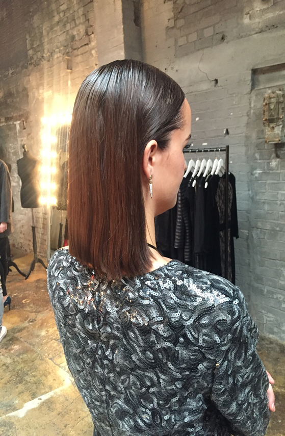 Step 1: “I wanted Alex’s hair to look really clean, so we pulled the hair back from the crown so it was flat. I used EIMI Shape Control Mousse throughout.â€